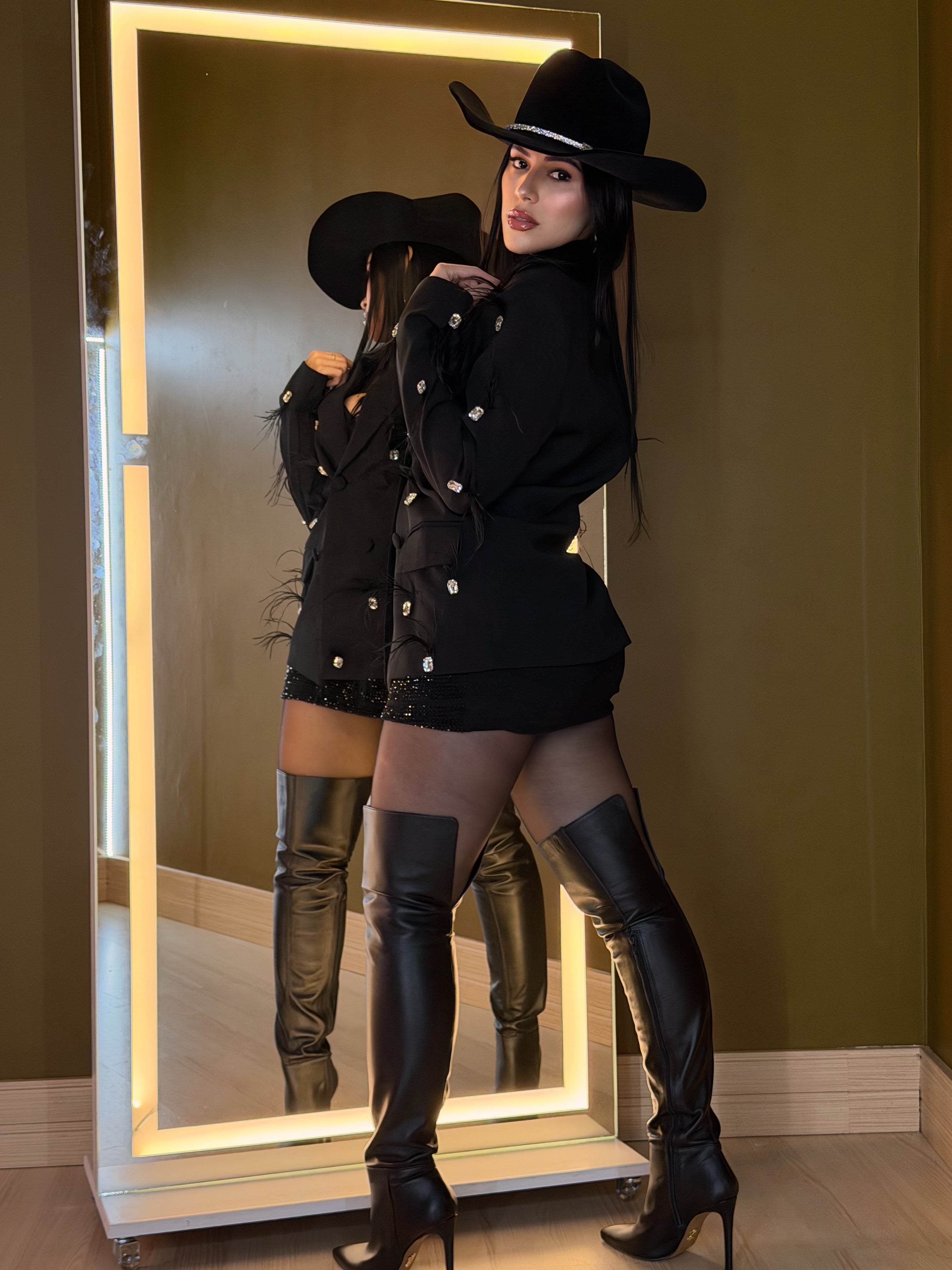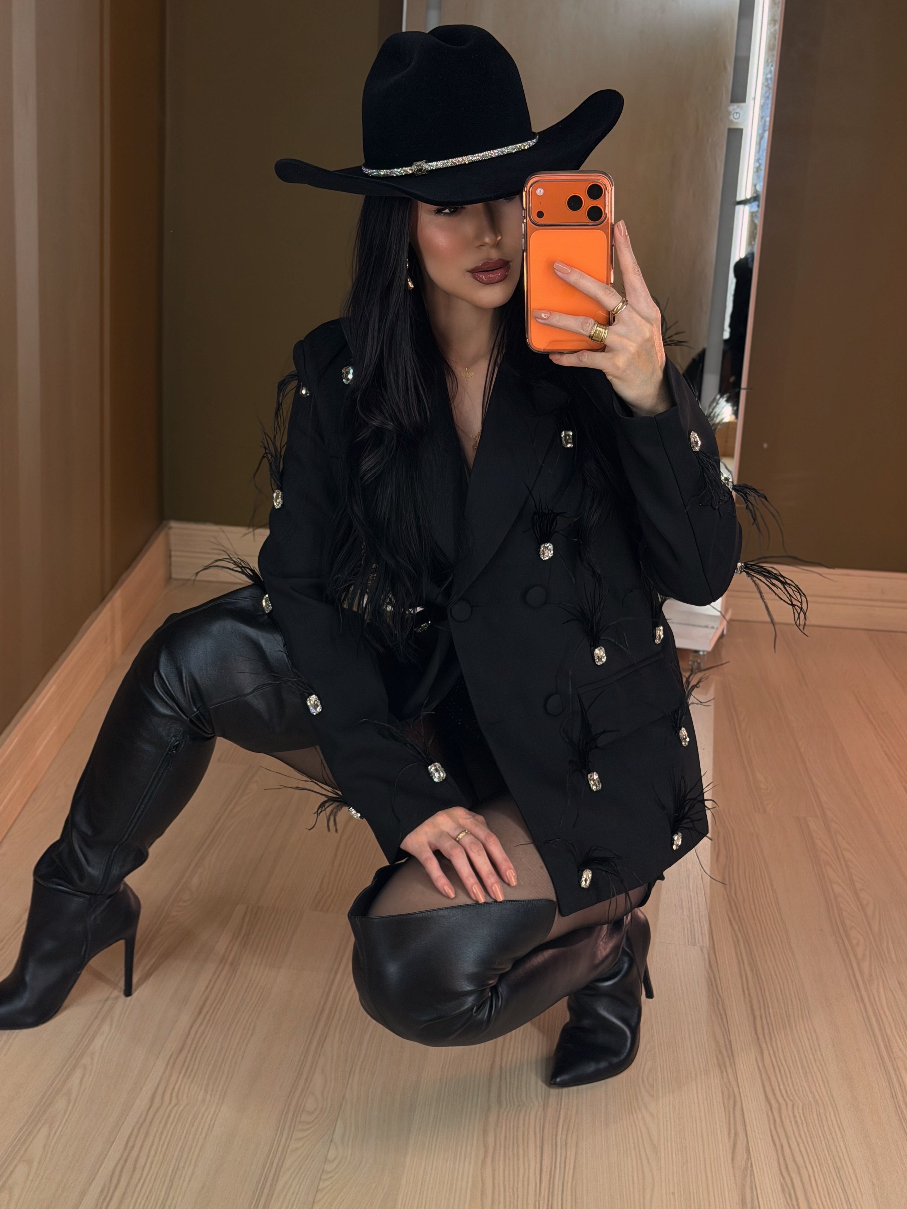Blazer Alongado em Alfaiataria Premium com Pedrarias e Plumas•