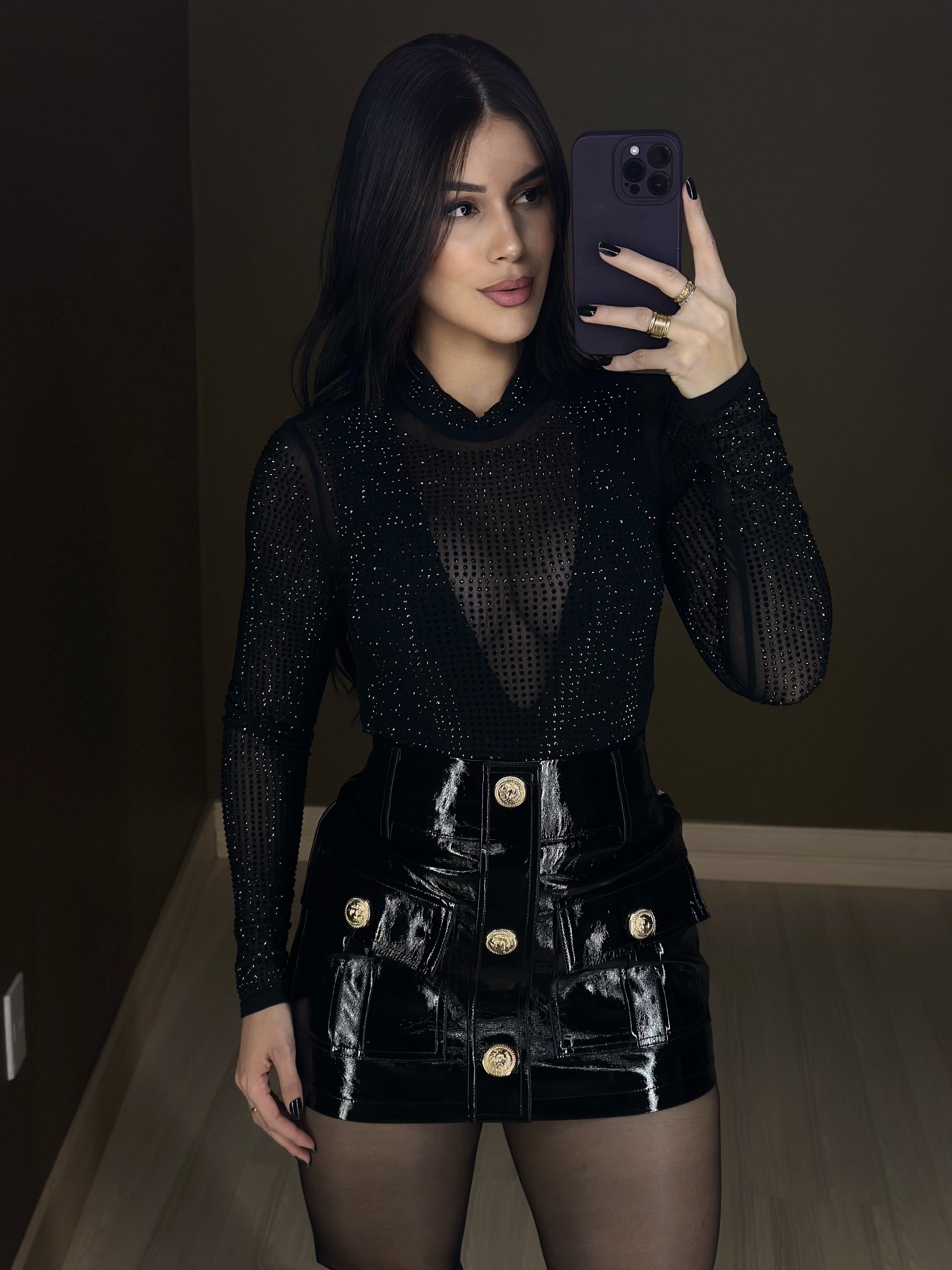 body de mangas longas confeccionado em tecido tule com leve transparência, com aplicações de strass hot fix, em alta temperatura, veste PM G42.