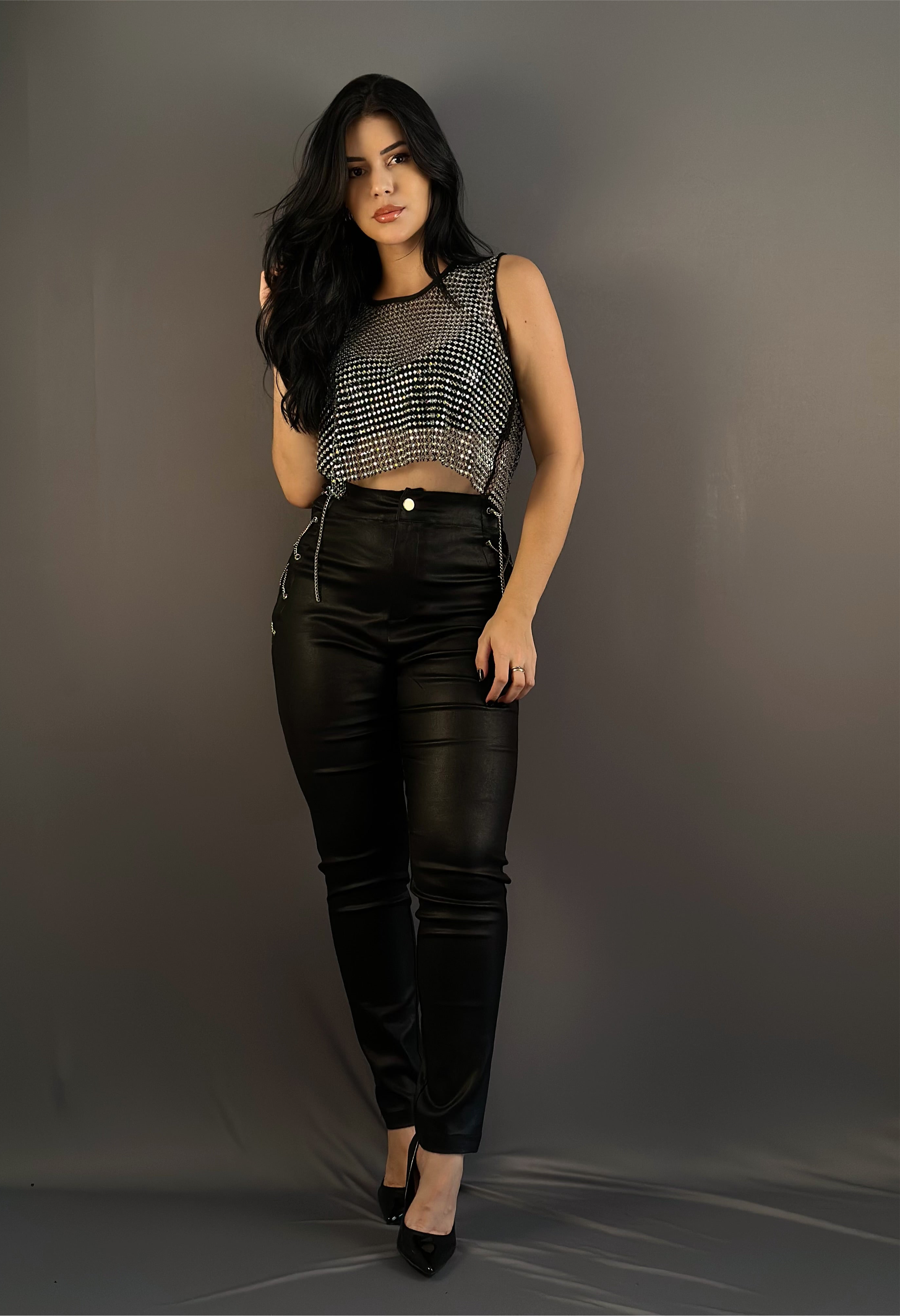 Combine com cropped, bodys ou camisas para criar looks sofisticados e cheios de personalidade. Para um toque extra de ousadia, aposte em acessórios metálicos e calçados de impacto!