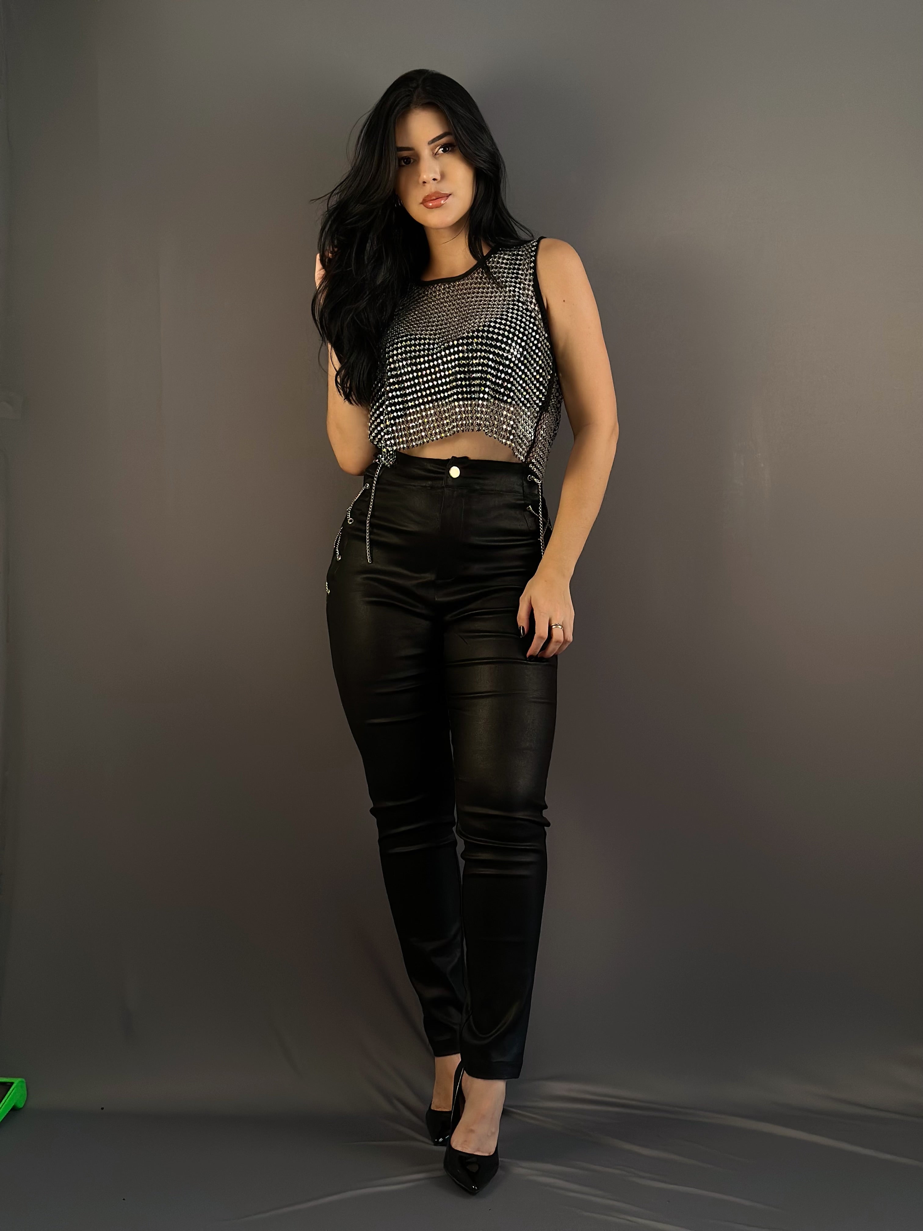 CALÇA COURO RESINADO COM CORRENTES LATERAIS – uma peça cheia de atitude e estilo! Com um acabamento sofisticado, o couro resinado confere um toque moderno e elegante, enquanto as correntes laterais adicionam um detalhe marcante e diferenciado.